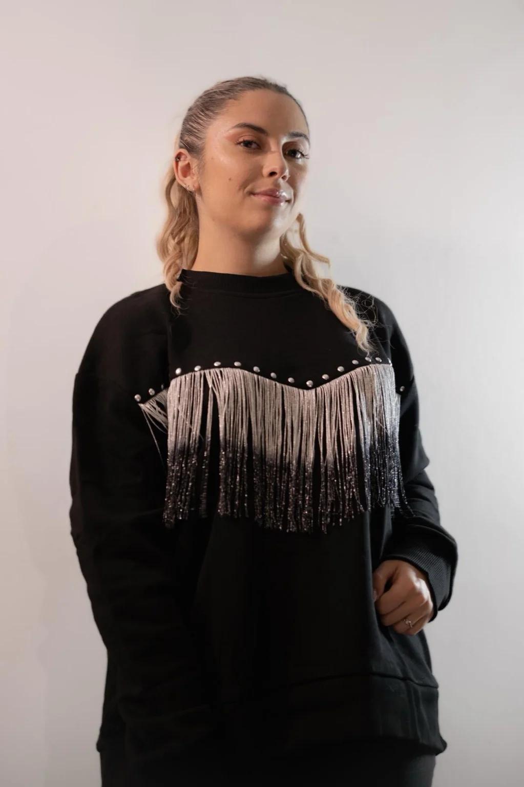 Orné de franges argentées scintillantes et de strass délicats sur la poitrine, il apporte une touche glamour et audacieuse à vos tenues du quotidien.